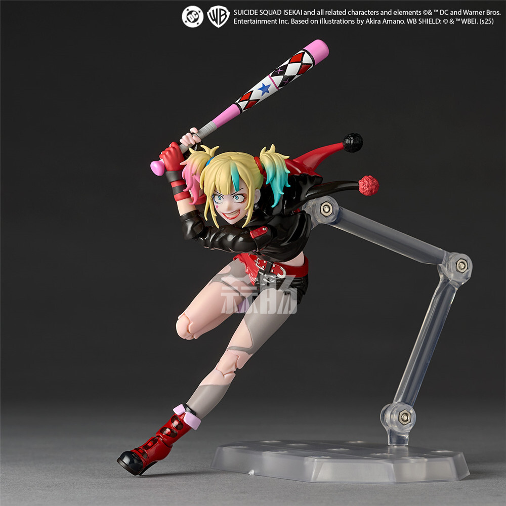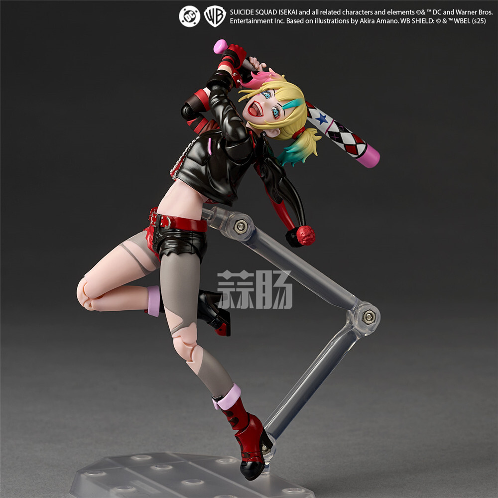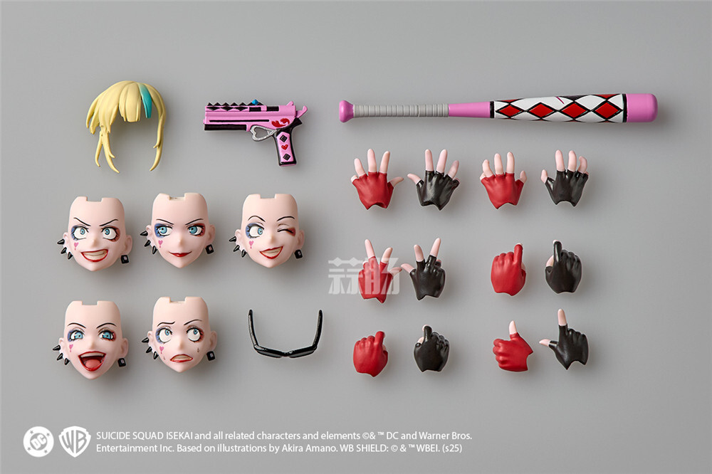 轉(zhuǎn)輪科技 哈莉·奎茵 可動人偶全高為15厘米。DC的經(jīng)典反派,哥譚的狂女“小丑女”哈莉·奎茵以動畫中的默認(rèn)人設(shè)進(jìn)行立體化。雙馬尾上粉藍(lán)雙色的不對稱漸變,劉海上一抹綠色挑染讓哈莉看上去十分可愛靚麗。日式動畫風(fēng)格的面容給人一種卡通質(zhì)感。紅黑雙色的著裝,連帽衫外套、上衣與短褲都采用了亮面漆涂裝展現(xiàn)皮革質(zhì)感。背后兜帽也采用了小丑帽設(shè)計。人偶附帶有5種“表情替換件”、1根“棒球棒”、6對“替換手型”、1把“手槍”、1架“太陽鏡”以及“太陽鏡專用劉海”。海洋堂特點為“壞笑臉”表情替換件。