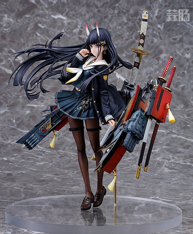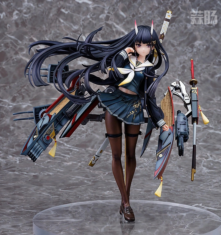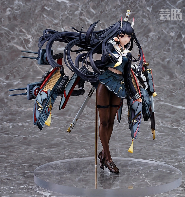 能代 1/7手辦全高 *** 為23厘米。手辦采用了游戲中能代的默認立繪造型進行立體化。頭上長著一對鬼角的黑長直少女,一頭長發隨風飄舞在身側,麗人展露出冷酷的面容。黑色水手服的百褶裙上也有著金色圖案,黑絲長包裹的一雙長腿曲線優美。身邊的艦裝也采用了CAD數據進行完美還原。精細的艦炮與武裝都沒有落下。